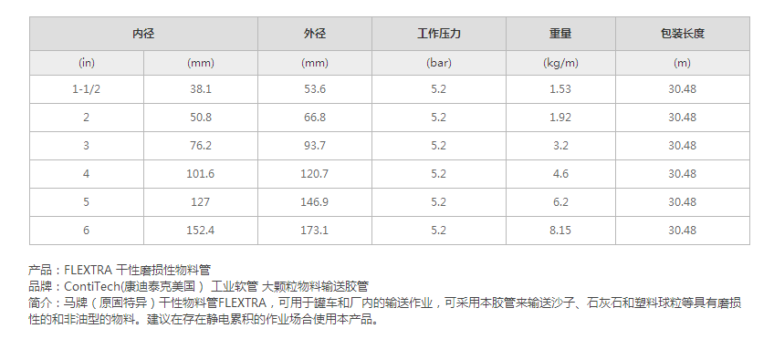 本產品是一種具有靜電放電性和靜電傳導性的膠管,可用于罐車和廠內的輸送作業,可采用本膠管來輸送沙子、石灰石和塑料球粒等具有磨損性的和非油型的物料。建議在存在靜電累積的作業場合使用本產品。